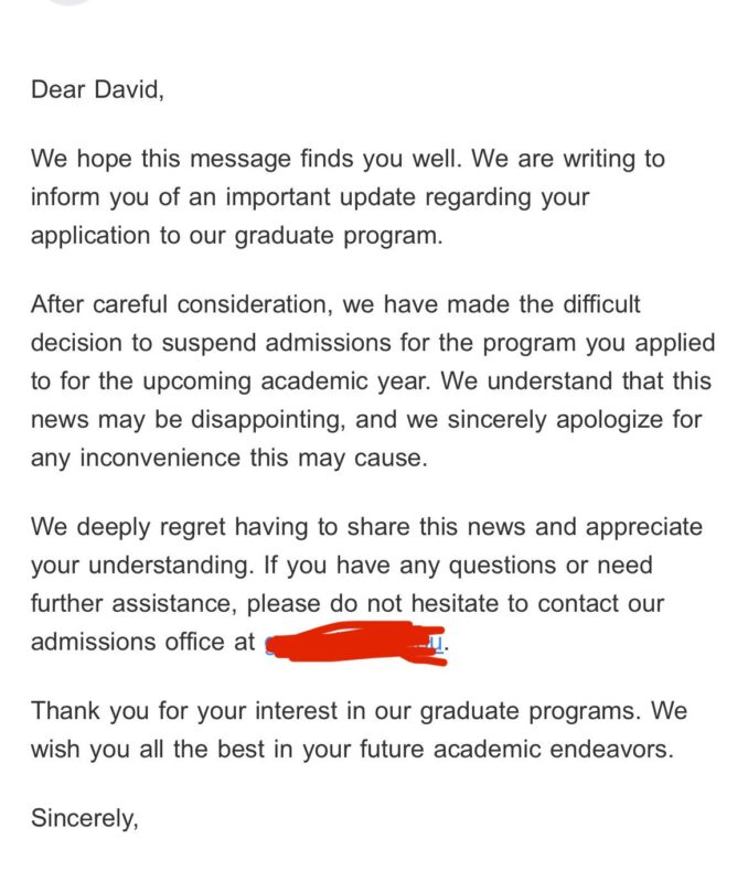 Cuối tuần qua, một ứng viên Tiến sĩ tiềm năng của Đại học Boston đã đăng ảnh chụp màn hình email trên Reddit bày tỏ sự bối rối của mình. Nội dung email có nội dung: “Chúng tôi đã đưa ra một quyết định khó khăn về việc đình chỉ tuyển sinh cho năm học tiếp theo đối với chương trình mà bạn đăng ký”. Người dùng đã sử dụng bút danh và hỏi trong bài đăng: “Có ai khác biết về quyết định của Đại học Boston không?” đình chỉ tuyển sinh cho năm học tiếp theo?” Việc nhận đơn đăng ký chương trình tiến sĩ có phải là một sai lầm không?