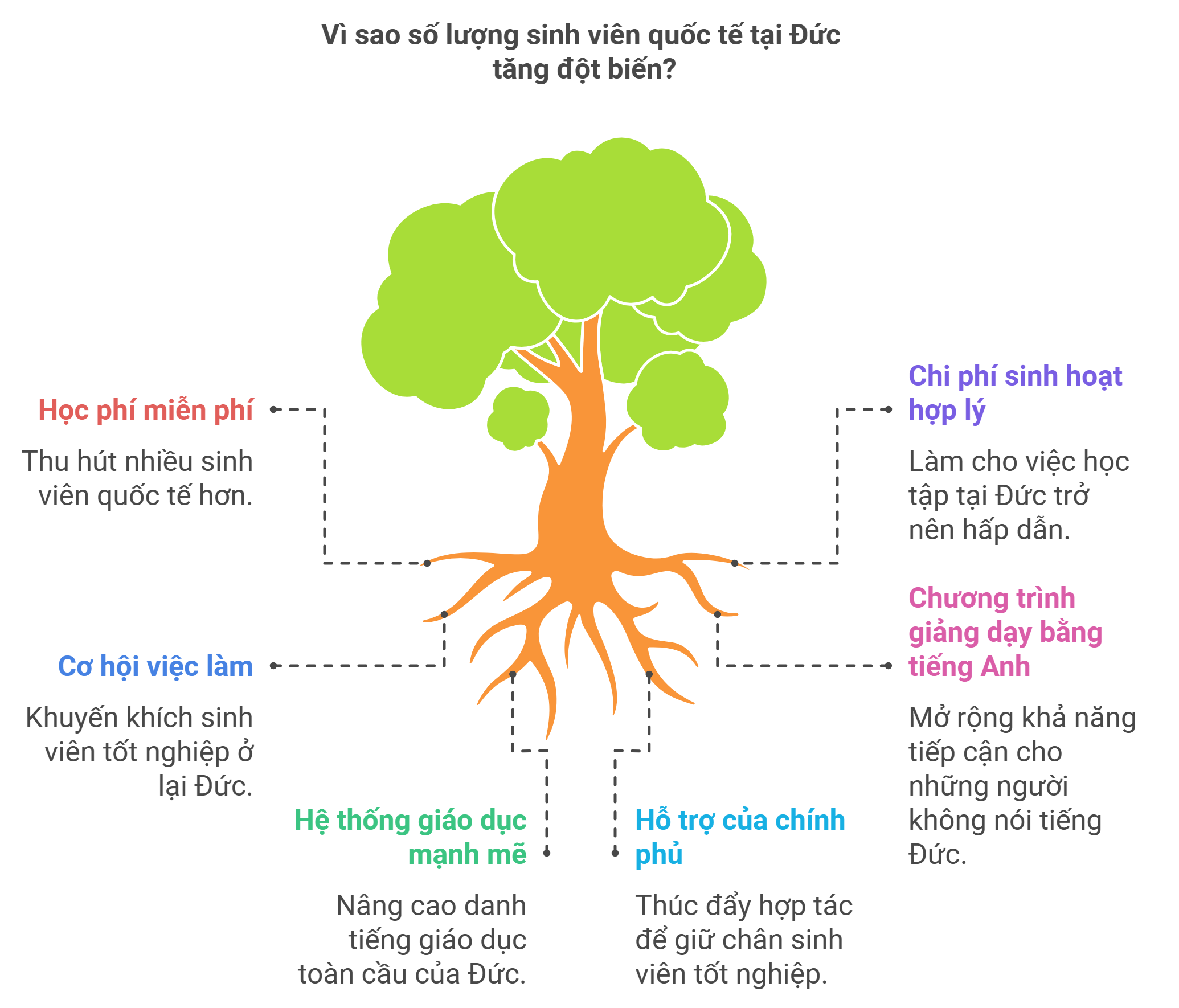 Theo khảo sát của Study in Germany, có ba lý do chính khiến Đức thu hút sinh viên quốc tế. Thứ nhất, học phí ở các trường công lập thường miễn phí, sinh viên chỉ cần chi trả một khoản phí hành chính khoảng 150-250 euro mỗi năm. Thứ hai, chi phí sinh hoạt tại Đức khá hợp lý – trung bình khoảng 930 euro/tháng, thấp hơn nhiều so với chi phí du học tại Anh hoặc Mỹ. Cuối cùng, sinh viên tốt nghiệp có thể ở lại Đức làm việc tới 18 tháng với giấy phép cư trú mở rộng, và gần 70% sinh viên quốc tế muốn tìm việc làm và định cư tại Đức sau khi hoàn thành học tập.